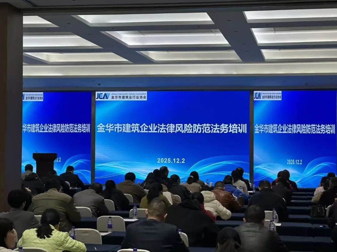 2025年12月2日下午,由金华市建筑业行业协会、金华仲裁委员会主办,金华市建筑业行业协会法务委员会承办的“金华市建筑企业法律风险防范法务培训班暨金华市建筑业行业协会法务委员会2025年度年终总结会议”在浙师大国际交流中心圆满落幕。市建协会长黄炜健、副会长王斌,市律协副会长应旭升,金华仲裁委副秘书长章敏,市建协法务委理事长朱妍等领导嘉宾,以及各委员会成员、行业同仁与企业代表齐聚一堂,共话行业法治发展。会议由市建协法务委副秘书长张紫慧主持。