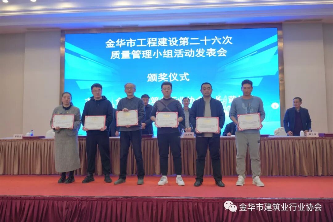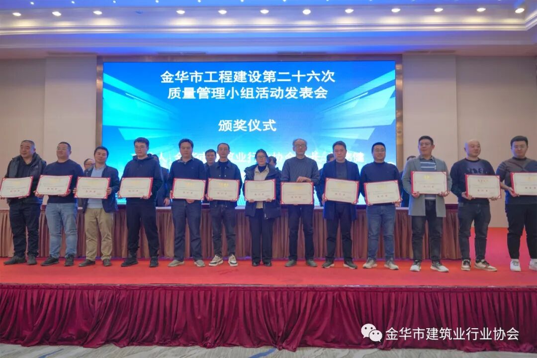 质量管理小组活动是增强企业自主创新能力的有效抓手,是推动行业和企业高质量发展的途径和载体。金华市建筑业行业协会已连续二十六年举行质量管理小组活动发表会,今年共有387个质量管理小组活动成果参与发表,有80个质量管理小组活动成果登台演讲。经评委会评审,30个质量管理小组活动成果获一等奖,45个质量管理小组活动成果获二等奖,75个质量管理小组活动成果获三等奖,237个质量管理小组活动成果获发表奖。东阳市建筑业协会、中天建设集团有限公司、新世纪建设集团有限公司、浙江新华建设集团有限公司、歌山建设集团有限公司、永润建设工程有限公司、浙江省东阳市南方建筑工程有限公司、浙江金立建设有限公司、海天建设集团有限公司、浙江省三建建设集团有限公司、金磐集团有限公司、广宏建设集团有限公司、明珠建设集团有限公司获组织奖。