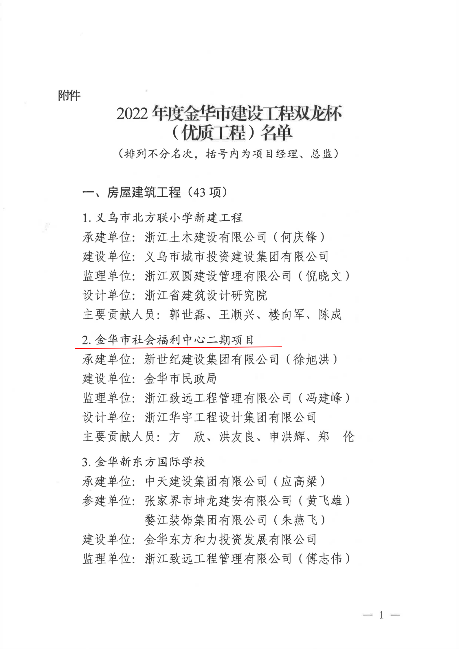 【转发】金华市住房和城乡建设局关于公布2022年度金华市建设工程双龙杯(优质工程)名单的通知