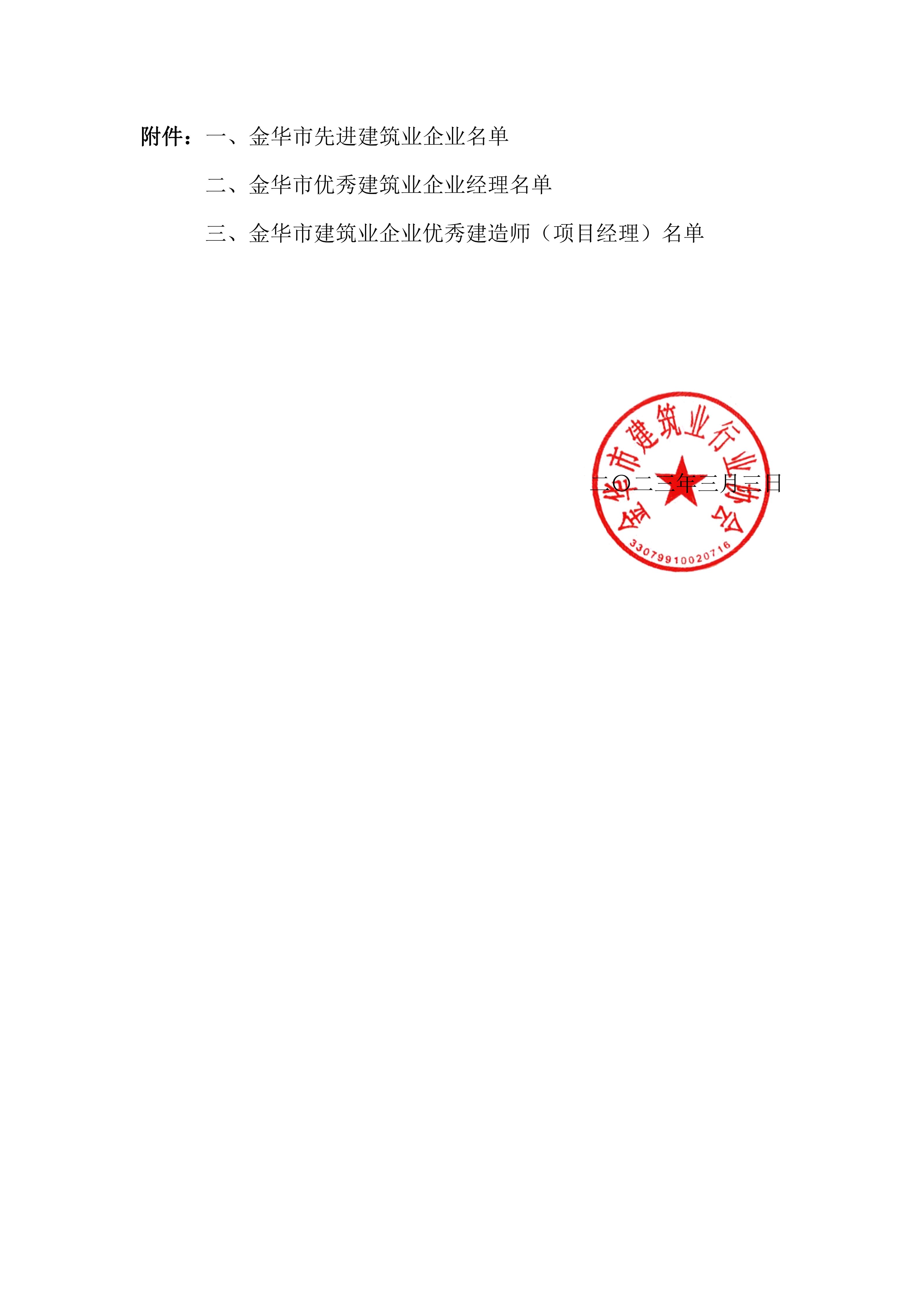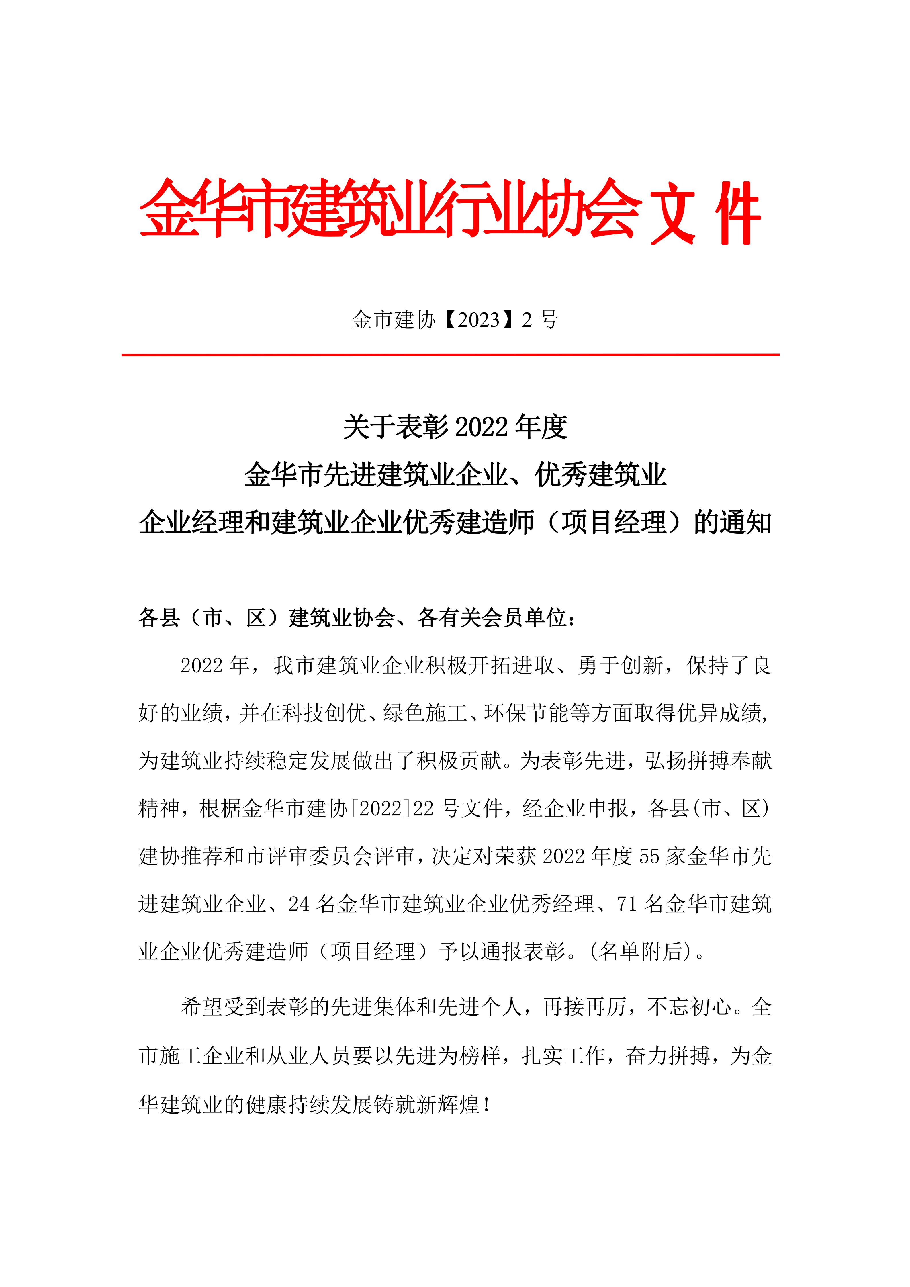关于表彰2022年度金华市先进建筑业企业、优秀建筑业企业经理和建筑业企业优秀建造师(项目经理)的通知