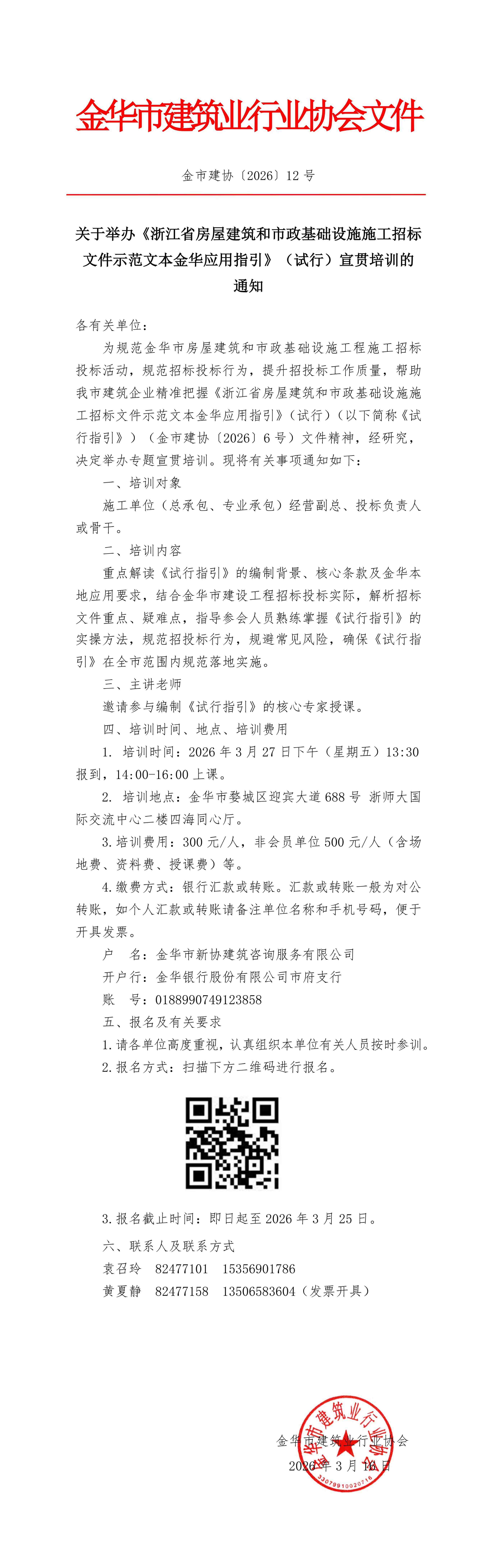 金市建协〔2026〕12号 关于举办《浙江省房屋建筑和市政基础设施施工招标文件示范文本金华应用指引》(试行)宣贯培训的通知