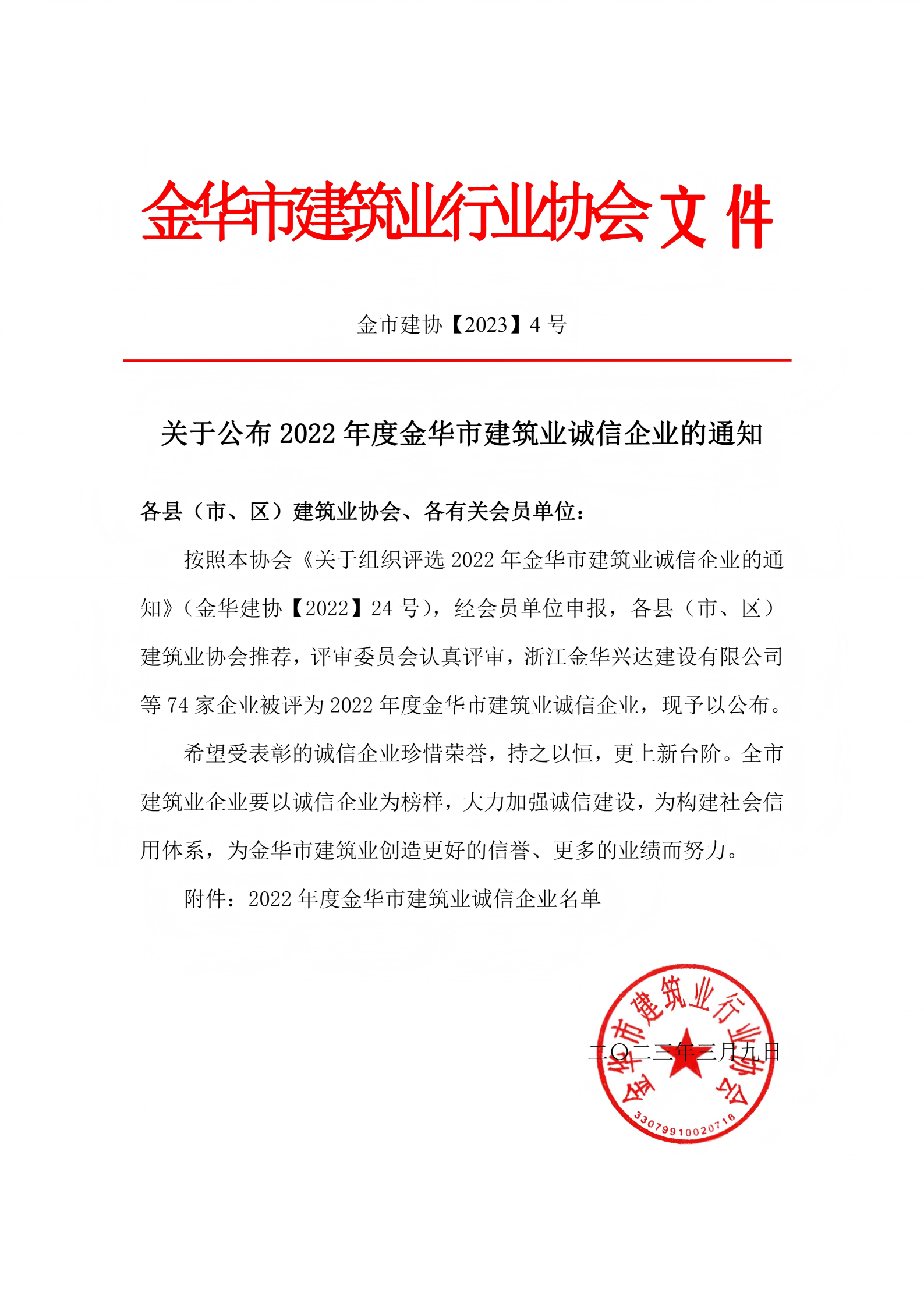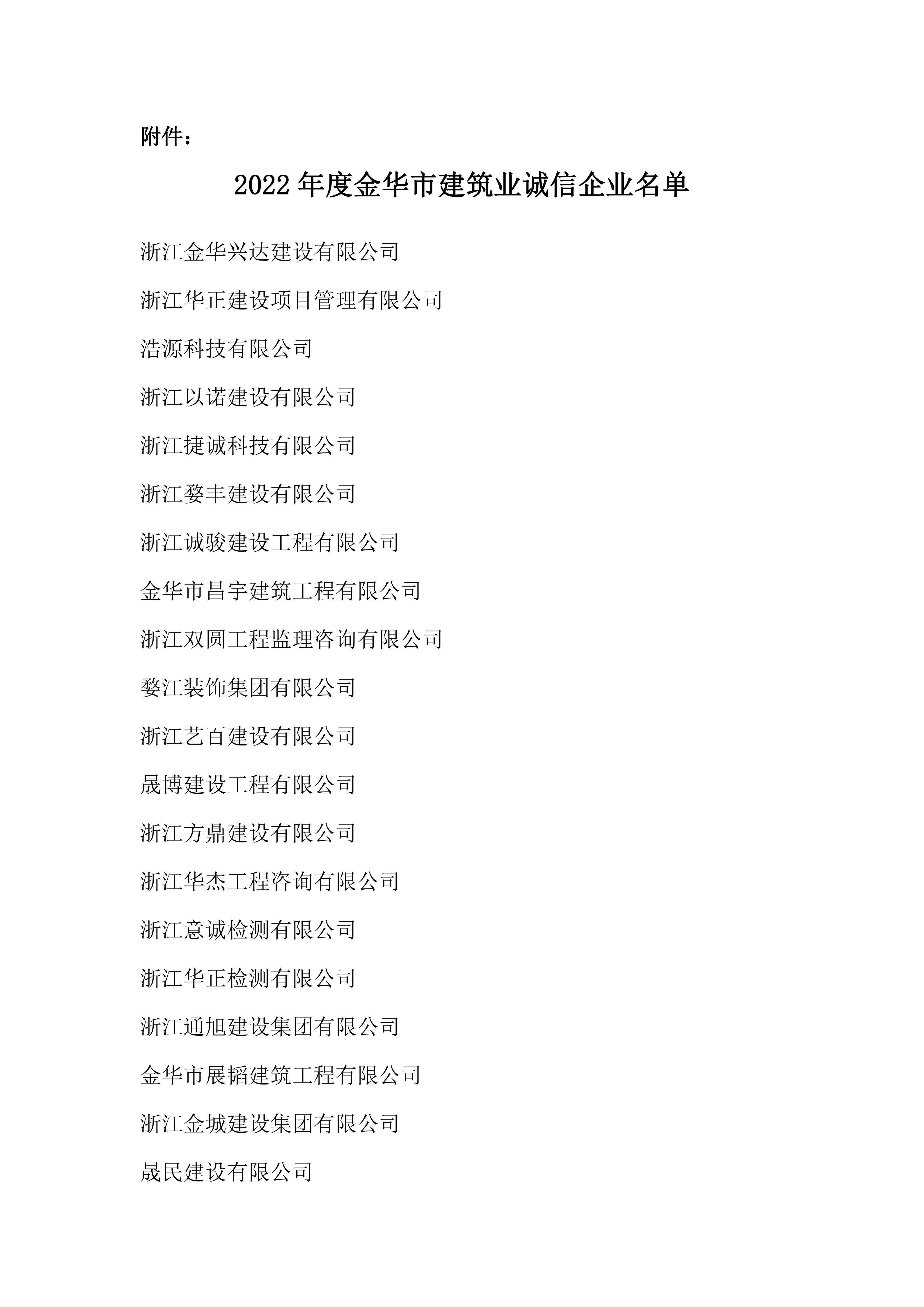 关于公布2022年度金华市建筑业诚信企业的通知