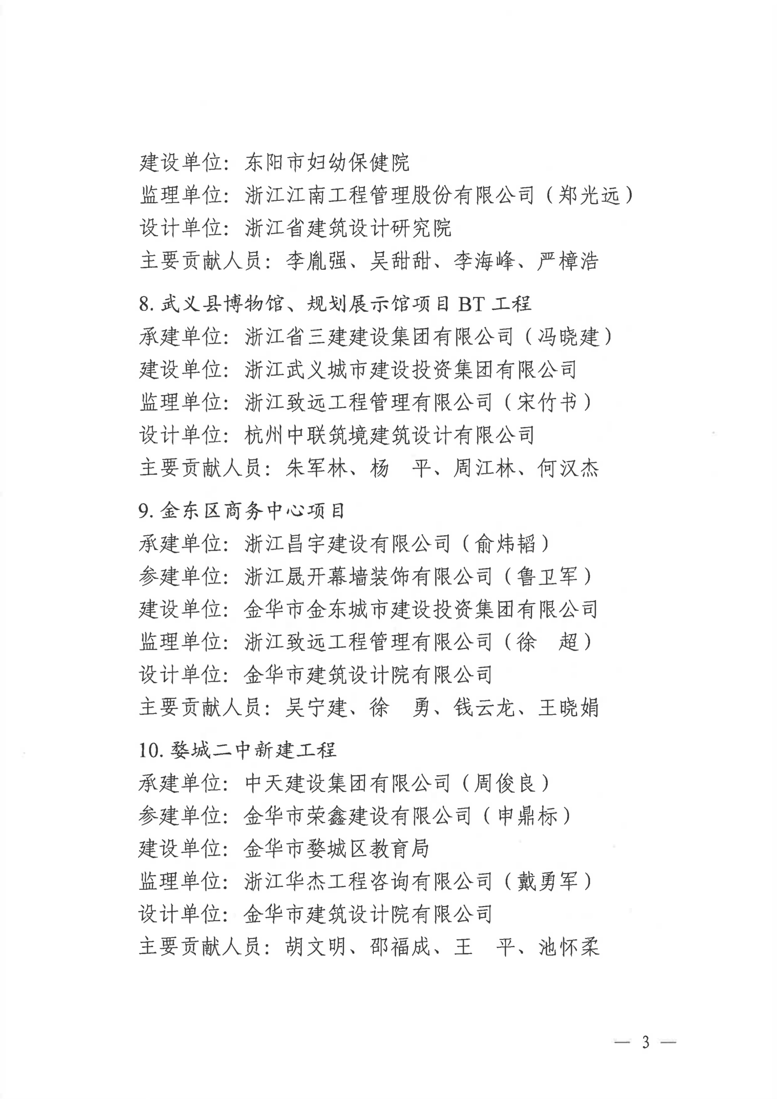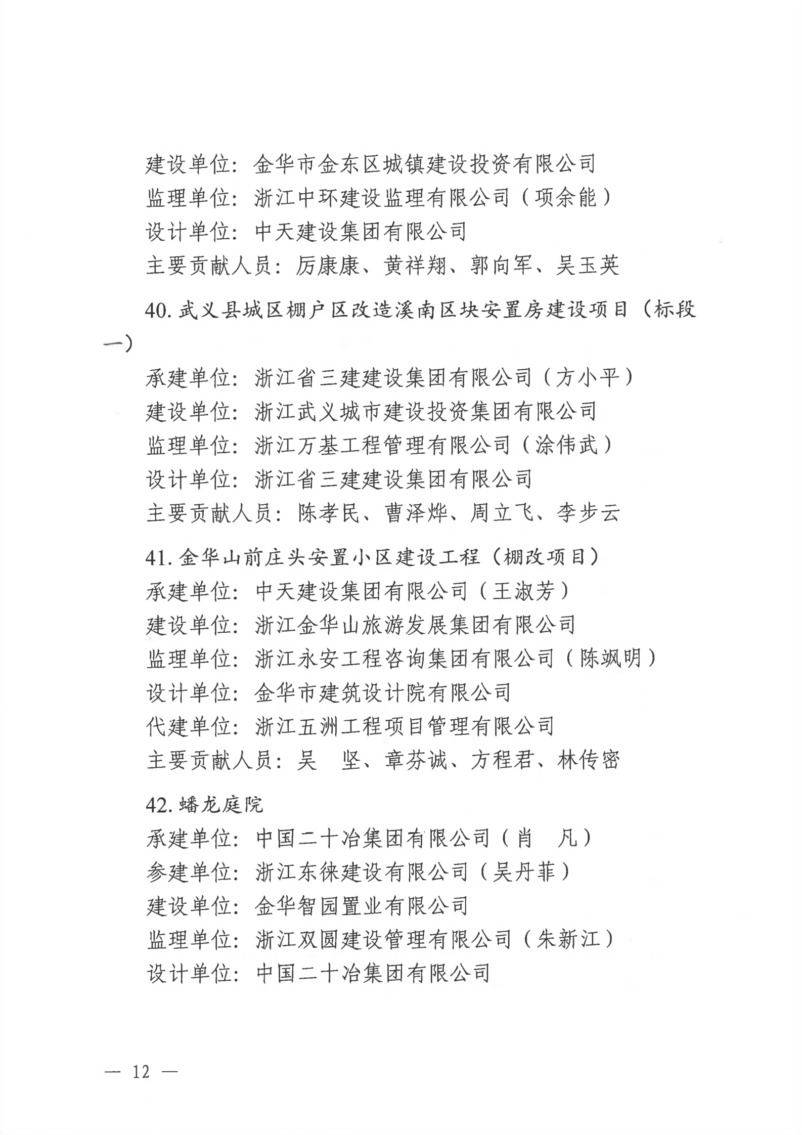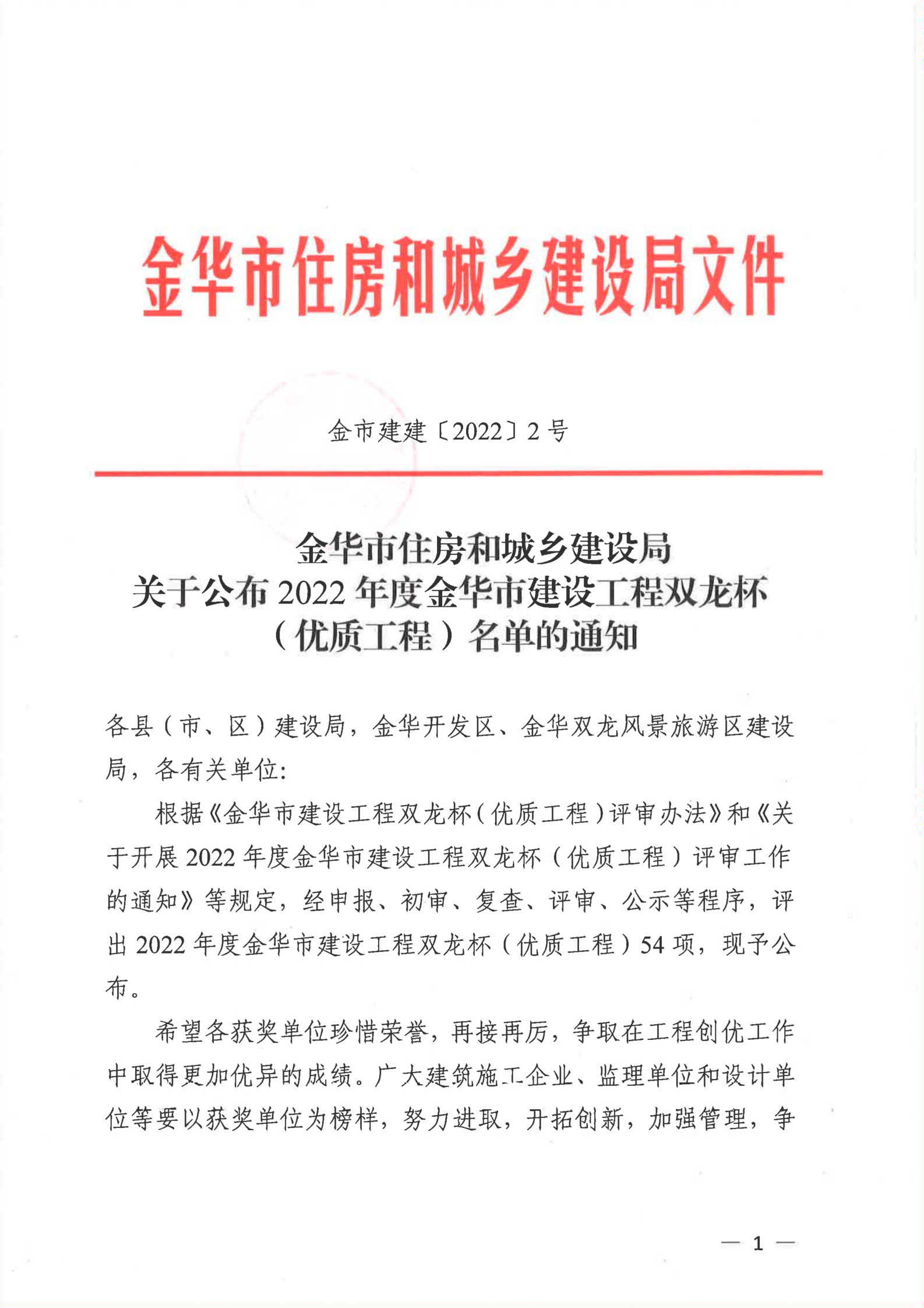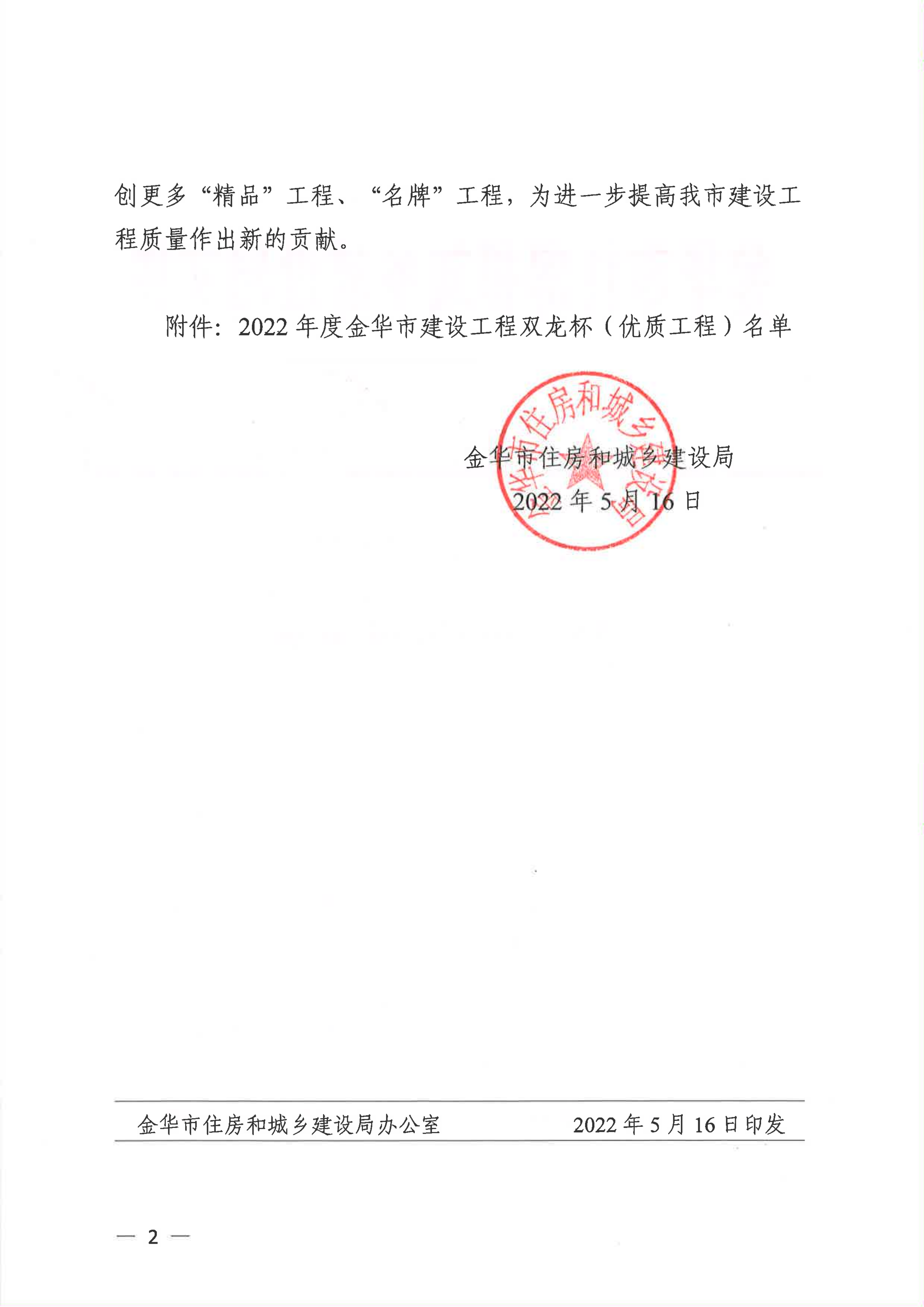 【转发】金华市住房和城乡建设局关于公布2022年度金华市建设工程双龙杯(优质工程)名单的通知